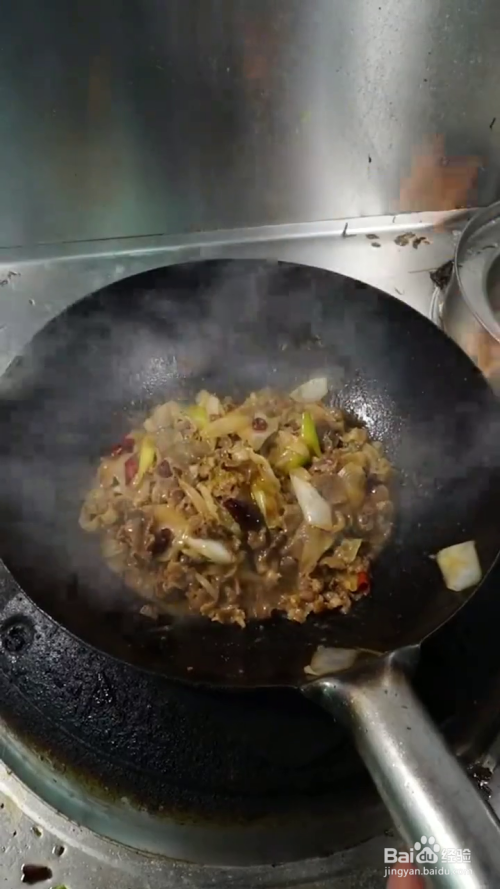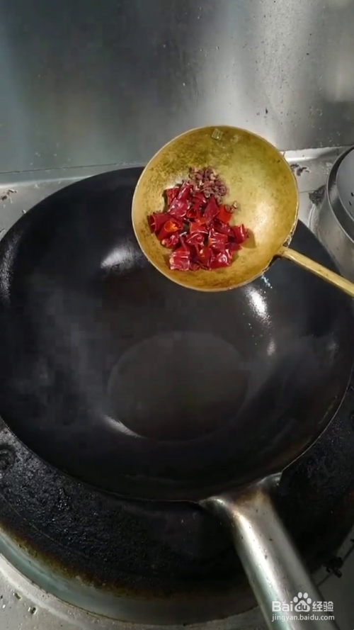 锅中烧油,油热下入干辣椒,花椒爆香,再放入大葱炒散炒软