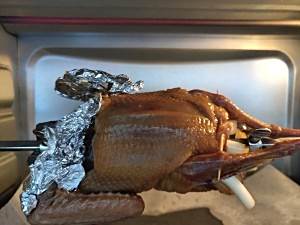 冷藏好后的小可爱拿出来,串上旋转叉,固定位置,然后给膀膀上记得包锡纸,不然就烤糊了