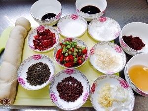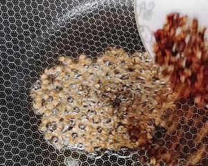 另起锅加入适量食用油小火操作,放入花椒粒、麻椒粒炸香,再放入干辣椒段,加入郫县豆瓣酱转中火翻炒,加入料酒、耗油,最后放入葱姜蒜炒香。