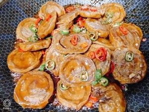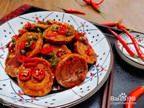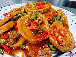 放入切断的青红线椒翻炒,然后水淀粉收汁,装盘。