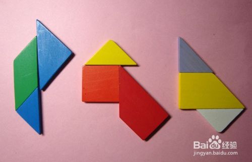 把九巧板准备好,可以每三块拼一个简单图形,先练下手,并数数九巧板的数目是否齐全,如下图所示。