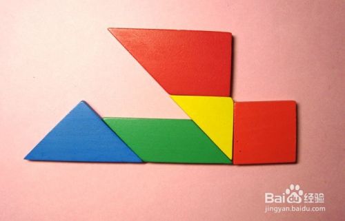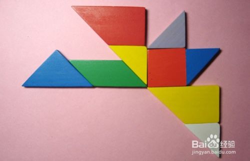 最后,取橘色的梯形板和白色三角形板连接,并摆放在红色正方形板的下边,拼接位置,如下图所示。这样,美丽的大雁图形就拼好了。可以让孩子仔细看一遍后,自己动手拼图,并不断回忆拼图的顺序,这可以锻炼孩子的记忆能力。培养孩子的过目不忘的能力,对孩子以后的学习有帮助。