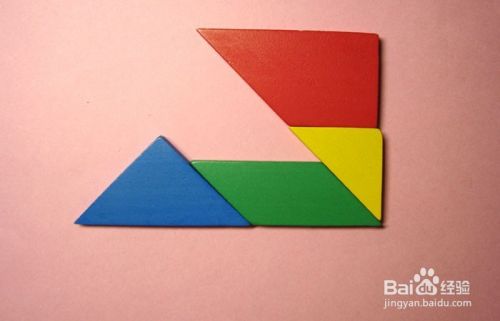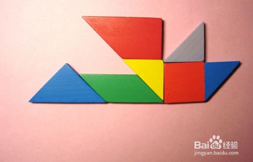 接着,把蓝色的三角形板与红色正方形板连接,并把紫色的三角形板摆放在红色正方形板的上方,作为大雁图形的尾巴,拼接位置,如下图所示。