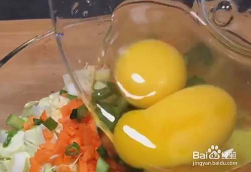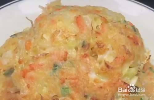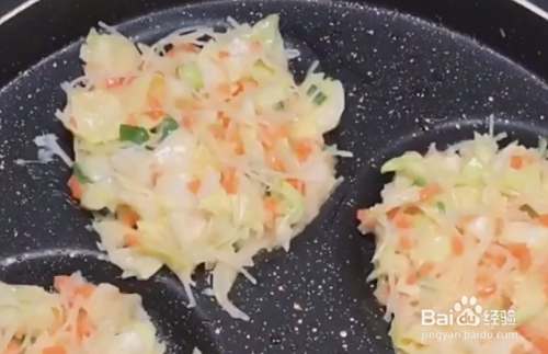 我们的锅用热油将它煎熟之后,我们的包菜粉丝鸡蛋饼就制作出来了。