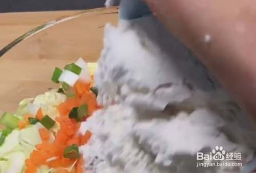 接着一块放入碗中,倒入适量的面粉和胡萝卜丁。