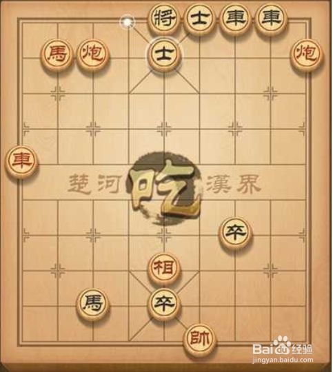 原棋局如下,此关,红方的进攻路线很窄。双炮都没有有利的位置,而且也无法阻止黑车的进攻。进兵直接失败,故只有平兵,移双炮阻止黑车进攻,而且也形成了重炮的局面。同时也拉大了车和马的进攻优势。