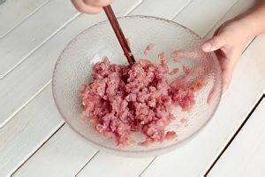 往肉馅后打入1个鸡蛋清。
