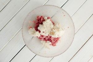 肉馅中加入1瓷勺料酒、1.5茶匙盐和适量白胡椒粉。