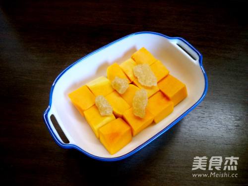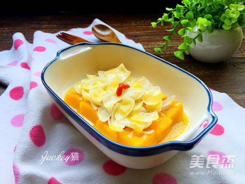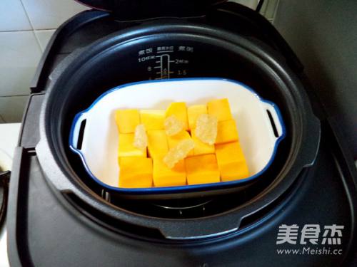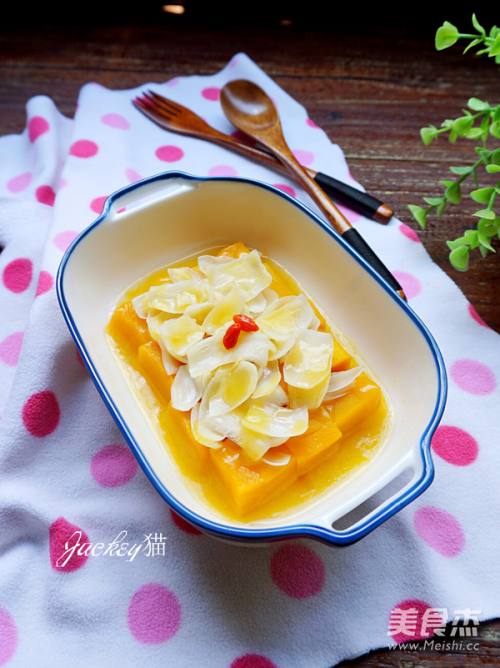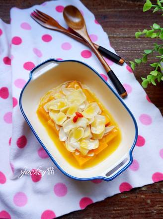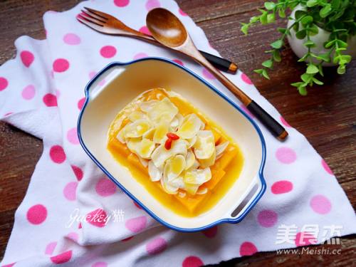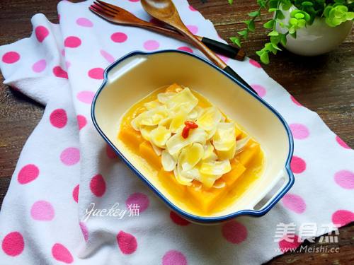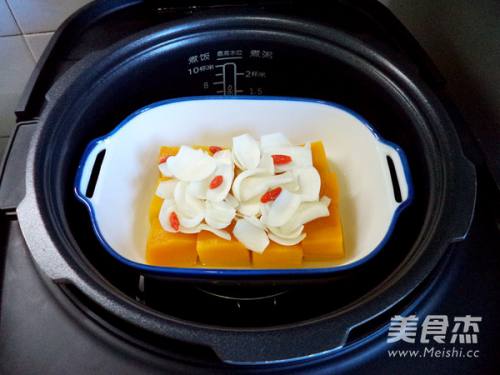 5南瓜蒸熟后,把鲜百合放入,继续蒸10分钟