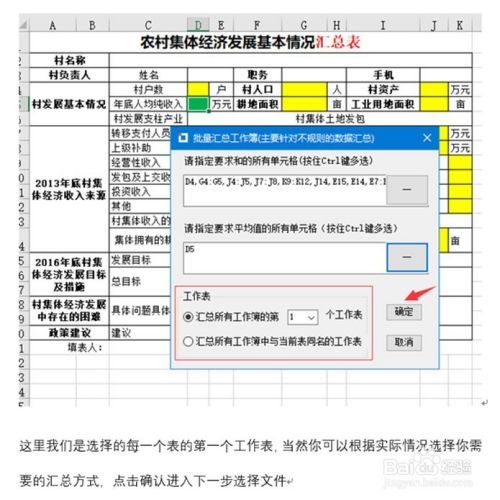 这里我们是选择的每一个表的第一个工作表,当然你可以根据实际情况选择你需要的汇总方式,点击确认进入下一步选择文件
