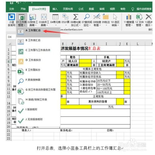 打开总表,选择小蓝条工具栏上的工作簿汇总