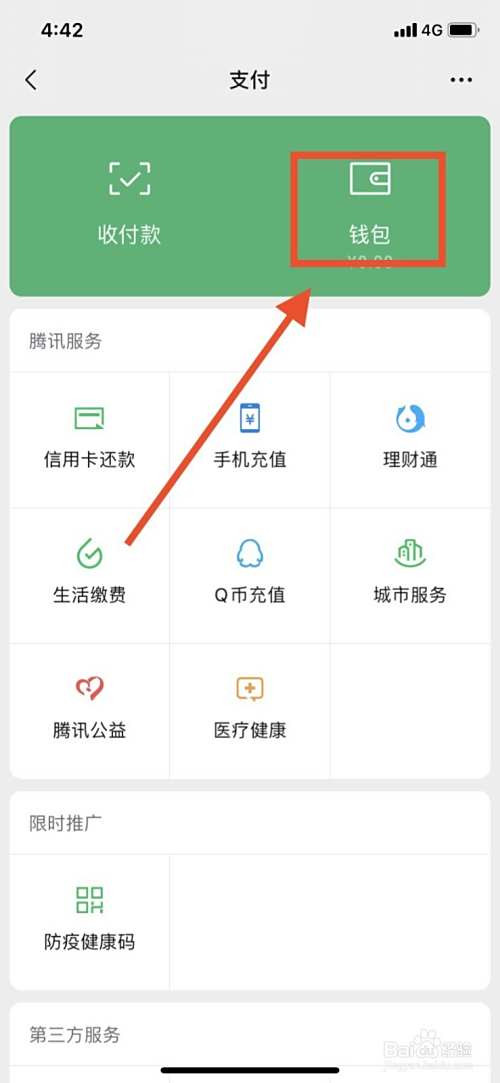 然后 进入到支付页面,在绿色部分框的位置找到”钱包“的位置,并点击进入钱包页面。