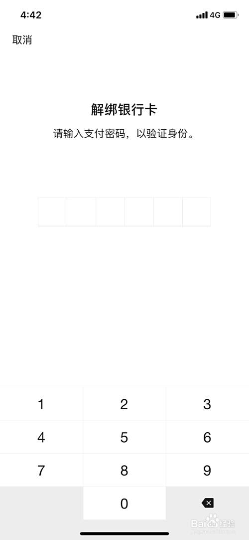 最后,又会弹出一个支付密码输入的页面,输入密码之后,就会显示解除绑定。当我们再次返回银行卡的页面时,我们可以看到刚才解绑的银行卡已经不在了。