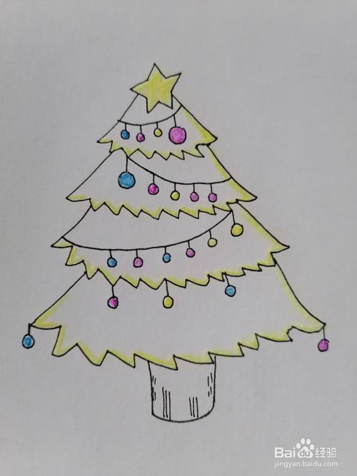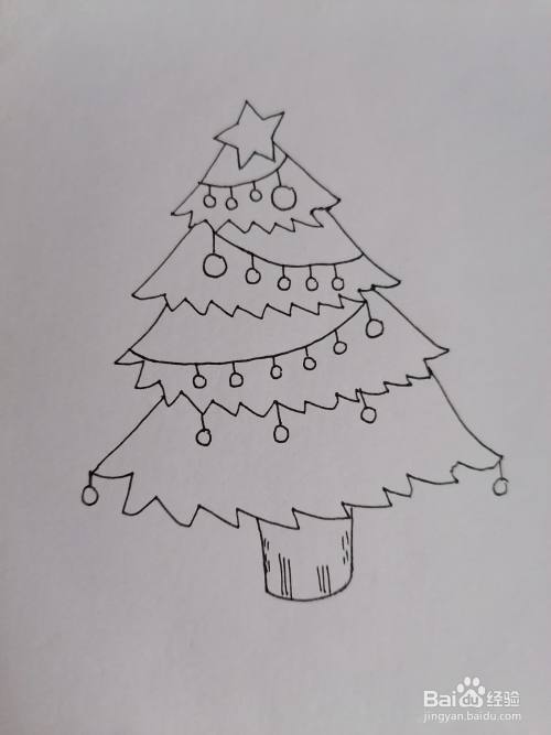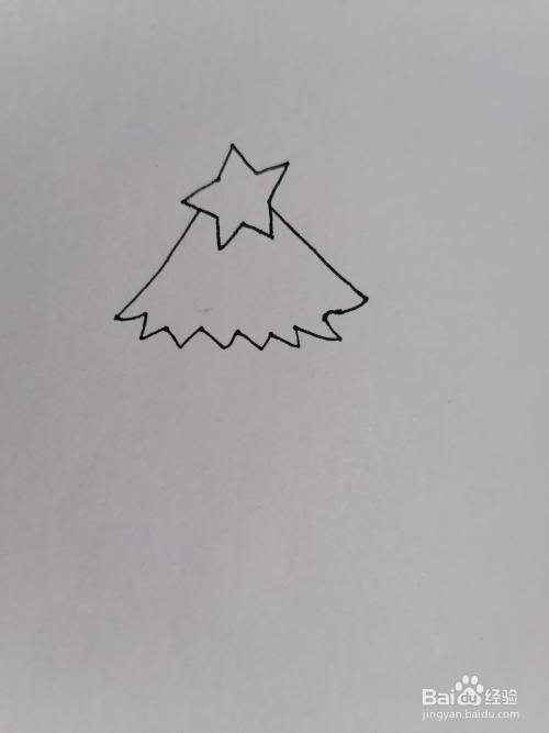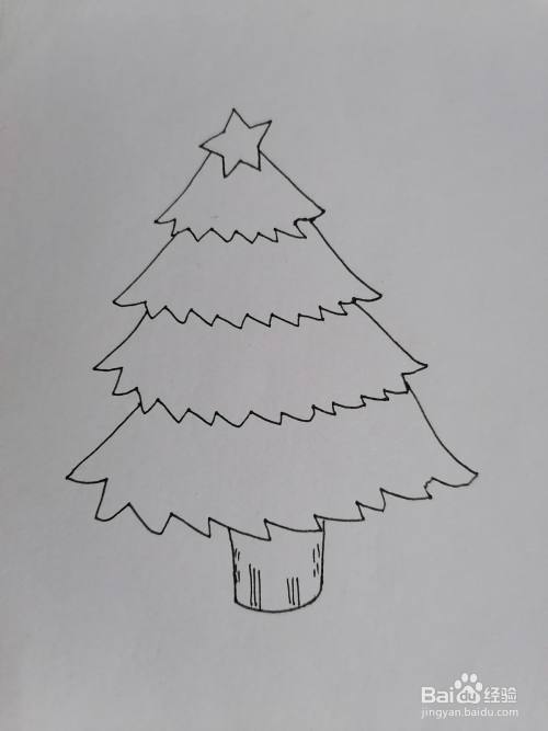 首先在纸上画一颗星星,下面画出圣诞树的树层和树干