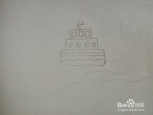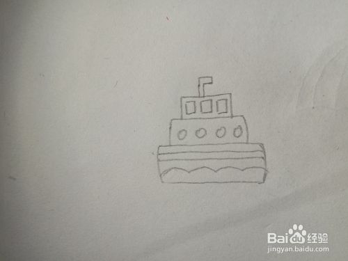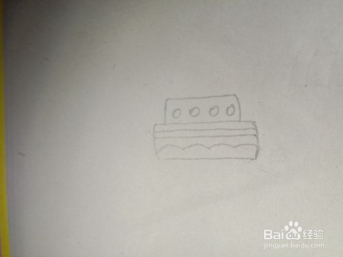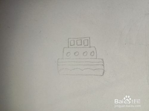 在画好的图形上画一个小点长方形,作为轮船的第一层房子,在里面再画四个圆,作为房子的窗户。之后再画一个比第一层小点房子,里面画三个小长方形作为窗户。