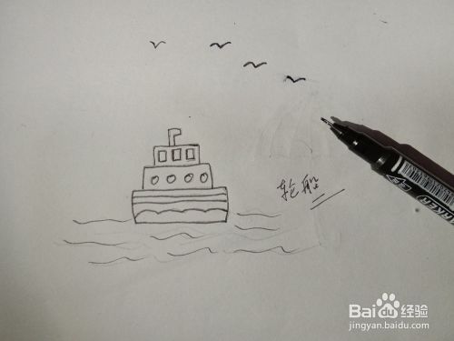 给整个画好的轮船用勾线笔描一遍,让图看的更清晰(你也可以填充颜色的),再在上面画一些带弧度“v”,作为海鸥。