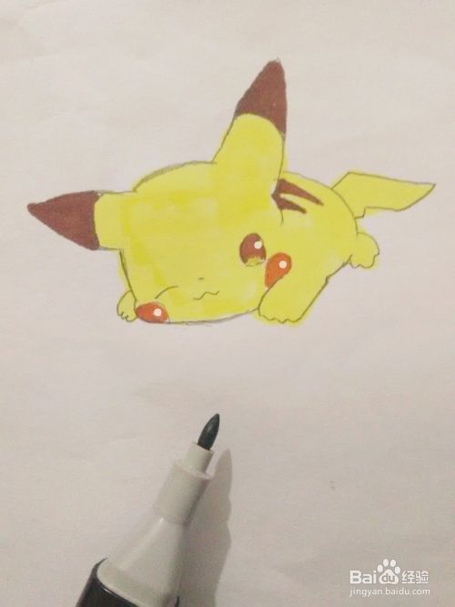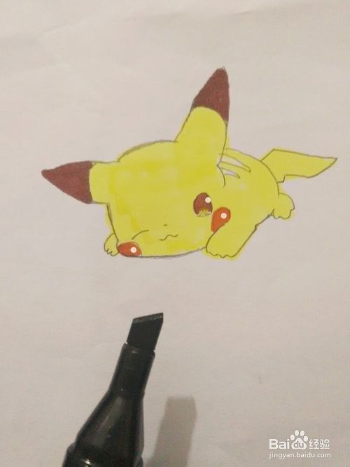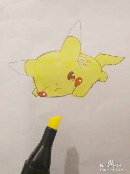 用黄色马克笔的平头涂它身体的大片区域,要一次涂好,不要来回涂。