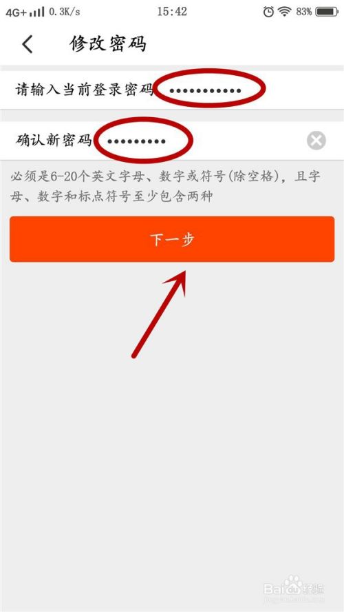 进入到修改密码页面,输入当前密码,再输入新的密码,最后点击【下一步】即可。