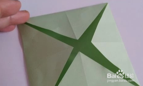 我们先把彩纸的中间折出个米字型来,打开后再把四个角向内折。