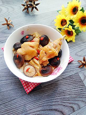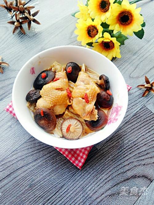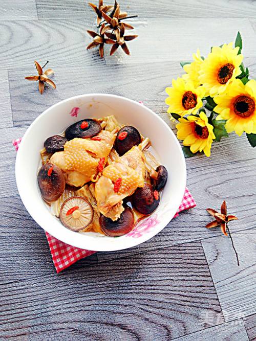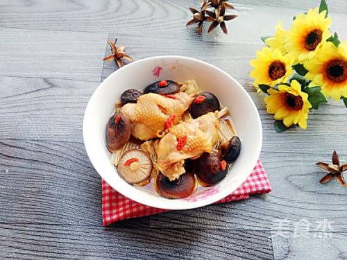 5腐竹和香菇码入盘中,再摆入鸡腿,腌鸡腿的料汁也不要浪费了,淋在香菇腐竹上,再淋入花生油,上锅蒸三十分钟就好了END