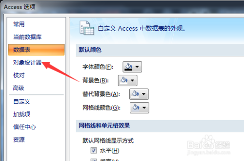 选中了access选项的选项之后,弹出了access选项的窗口中,选中为 对象设计器 的选项。