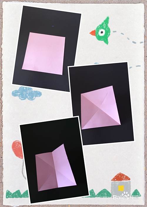 准备方卡纸一张,向内沿对角线对折,继续沿中线对折,如图所示。