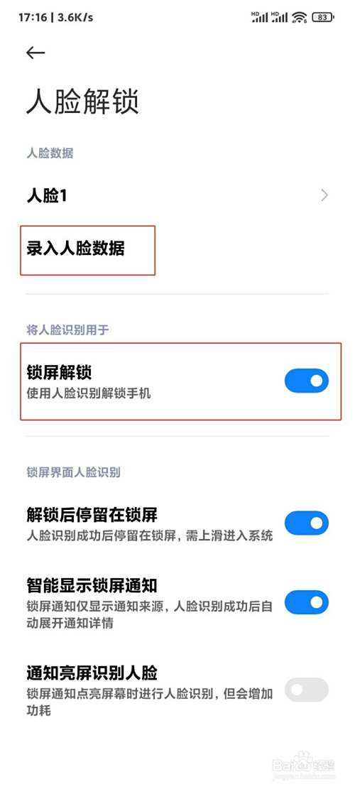 进入人脸解锁界面后,点击“录入人脸数据”进行人脸数据录入,录入完成后点击下面“锁屏解锁”后面的按钮,开启人脸识别解锁。这样就完成人脸识别设置了。