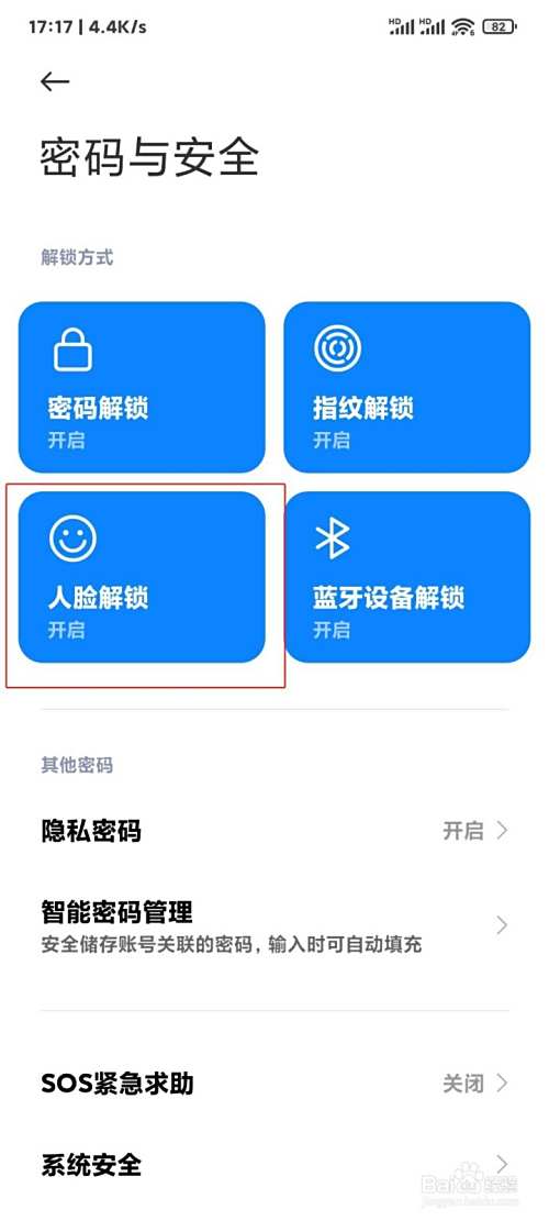 进入密码与安全后,点击“人脸解锁”进入设置。