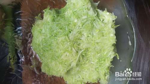 第一部,西葫芦洗干净,切开两半,用擦丝的刀具擦成细丝!撒点盐,腌一下,去除多余水分!