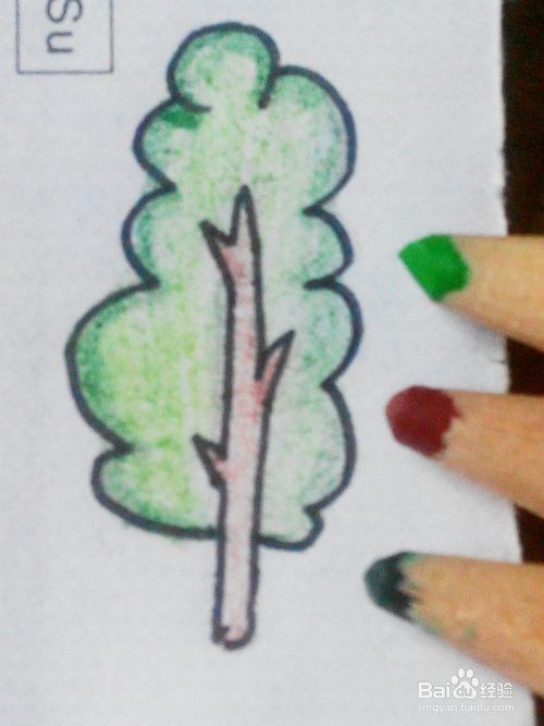 最后--用彩铅中的深绿色涂出叶子的边,再用翠绿色涂出叶子内部的颜色,接着用棕色涂出小树树干的颜色就可以啦。