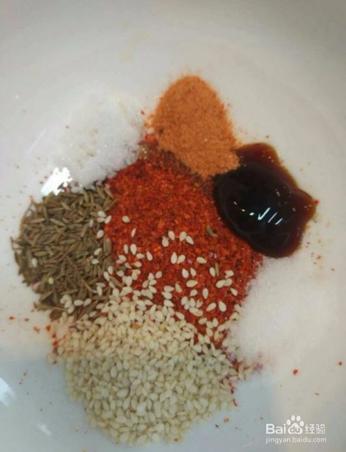 再准备调料。准备一个小碗加入2勺的麻辣鲜、2勺的辣椒粉、1勺的耗油、适量的糖、芝麻,孜然。