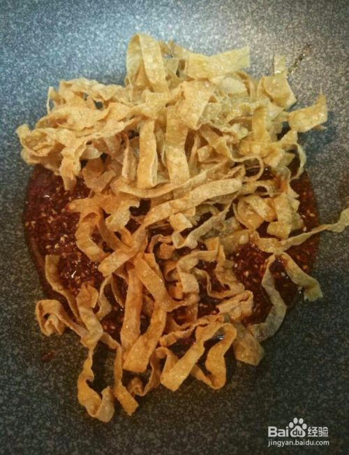 再把调好的辣椒油给倒入锅里,炸好的豆皮也倒入锅里,中小火。