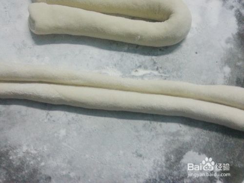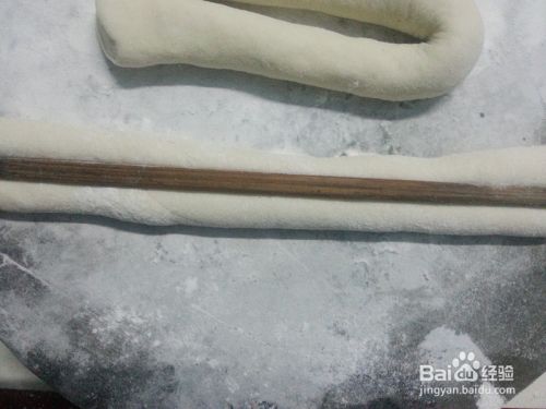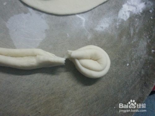再拿一个小面剂,在中间挖个小洞,形成一个小圈,如图,然后把小圈打开,拉直,揉搓成条。