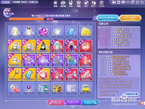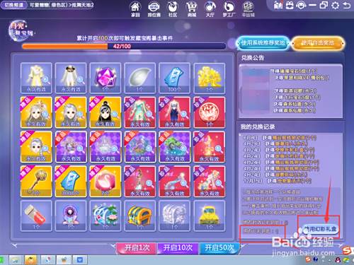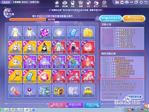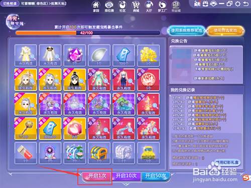 例如此图,只有1个幻彩钥匙,故点击“开启1次”,则消耗一个幻彩钥匙,即可看到抽奖结果,还可在我的兑换记录中查看结果。