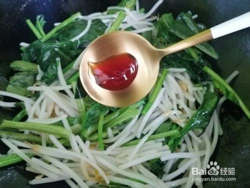 倒入适量的蚝油调味提鲜,因为一般在炒绿叶菜的时候是不需要放酱油的,所以我们放一点蚝油来提味。