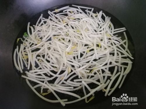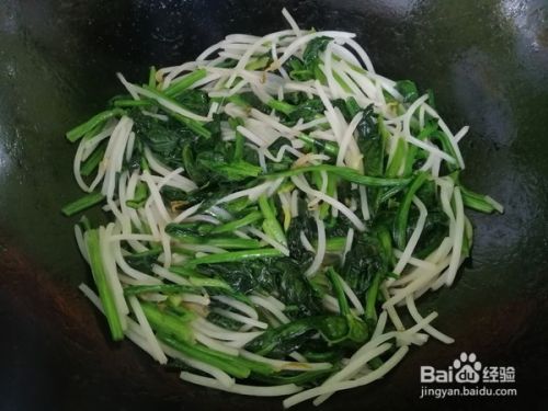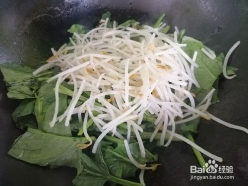 锅里倒入油,放葱花炝锅,然后倒入切好的菠菜和绿豆芽翻炒。