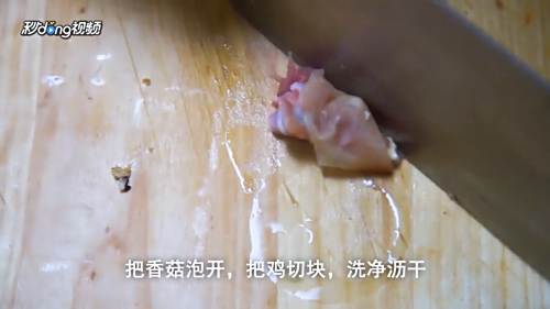 1把20g香菇泡开,鸡切块,洗净沥干。