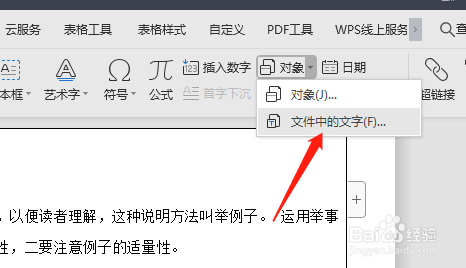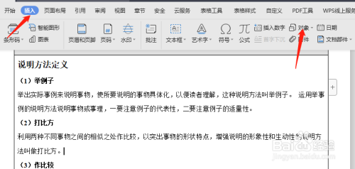 点击工具栏的“插入”按钮,然后再点击“对象”。