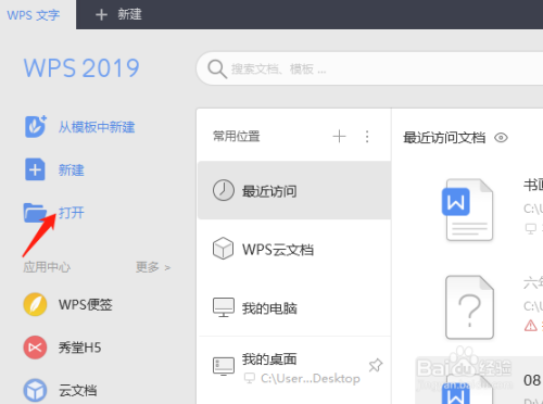 首先,打开wps,点击“打开”一个文件,如下图所示。