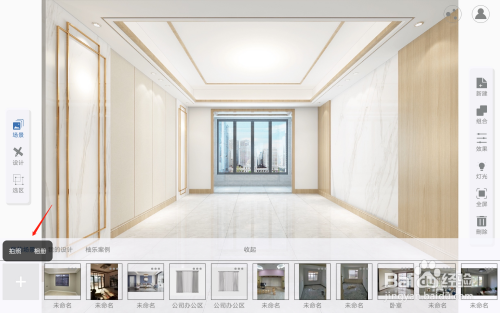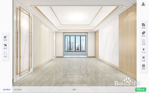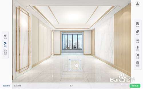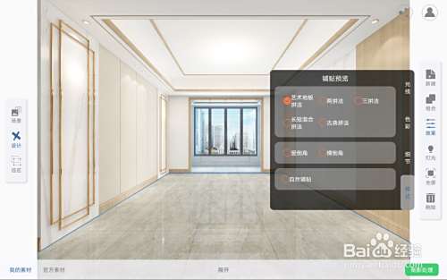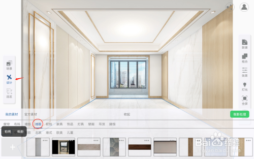 回到主页面后,点击左侧的设计选项,接着点击左下角的地板样式,选择想要展示的地板样式,如果没有自己想要的地板样式,也可以直接点击左下角的加号通过拍照或相册的方式,添加进去自己的样式。