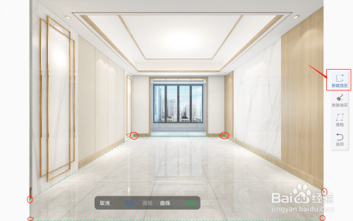在户型图中对需要展示效果的位置进行编辑。首先点击右侧“新建”,定点几个选点,将想要展示地板的区域框选出来,选完之后,点击完成返回主页面。