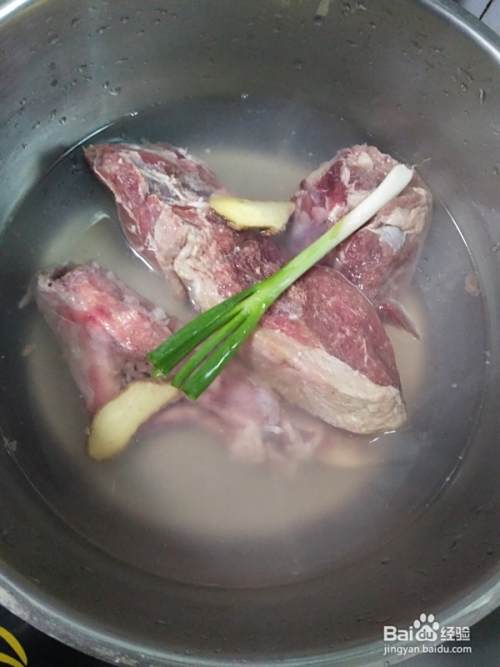 锅中加水放入羊肉姜葱煮出血沫