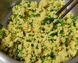 酵母加入温水活化、芹菜叶洗净控水备用,准备好所有食材后~~~玉米面中缓缓加入开水(一定注意安全),用筷子搅拌成小面团、无干粉,就可以啦!