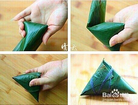 将叶面压平,用你的右手将粽叶边向下折,并赶快用左手手指压住,迅速把左边的叶向下折,并用左手大拇指压住