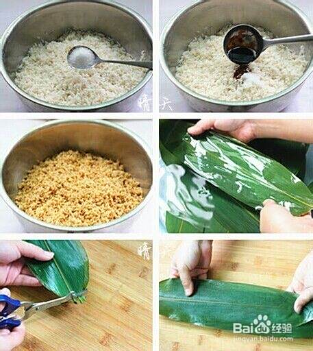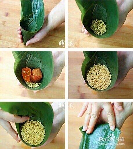 左手握住棕体,右手捏住粽叶,靠米粒3——4厘米部位