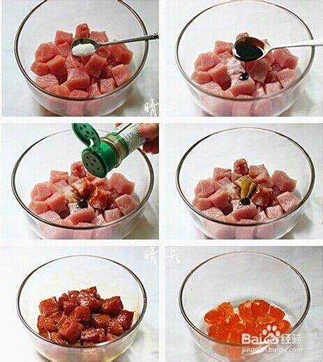 把里脊肉洗净后切方块,加上料酒、盐和味精