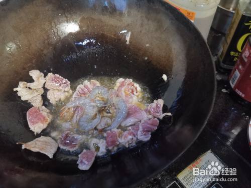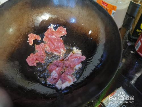 炒至肉片变色后,下入切好的洋葱丁,炒出葱香味,让肉片吸收葱油香味