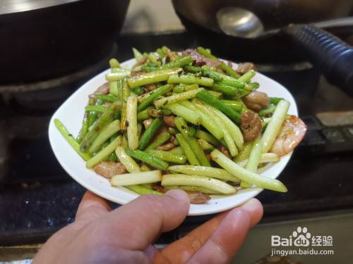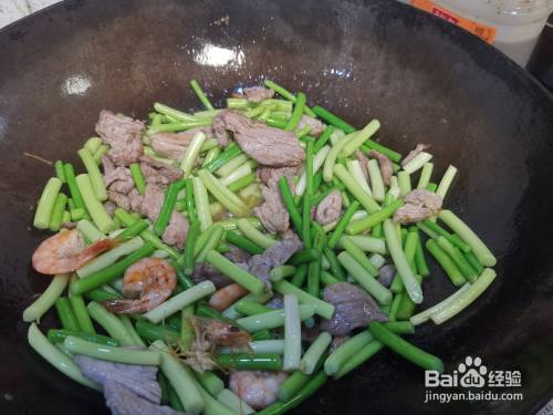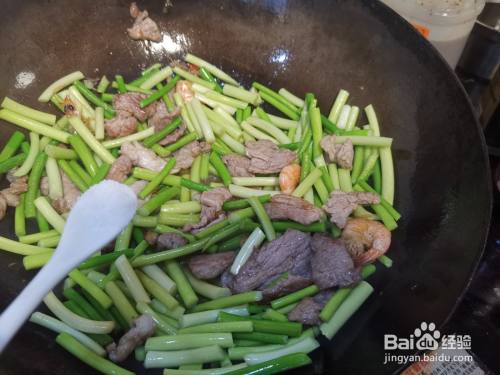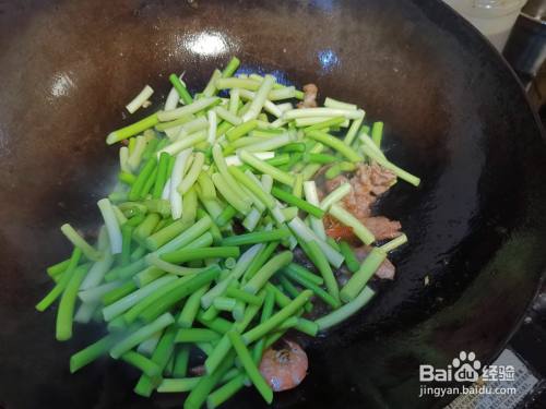 下入洗净后切成段的蒜苔,在锅中翻炒,让蒜苔在锅中受热均匀