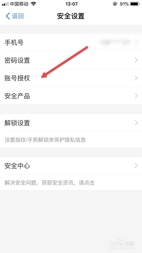 在安全设置界面,点击账号授权,如图