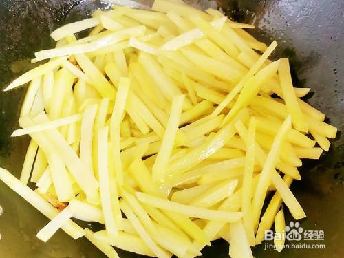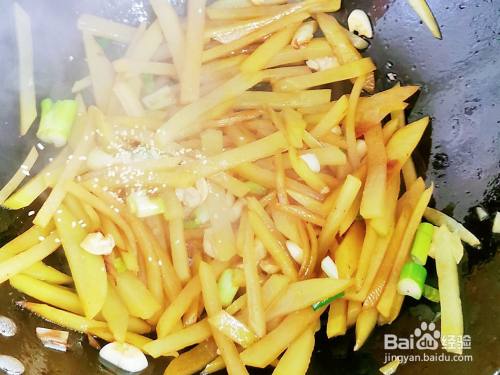 起锅烧油,倒入葱白炒香,再放入沥水的土豆条翻炒。